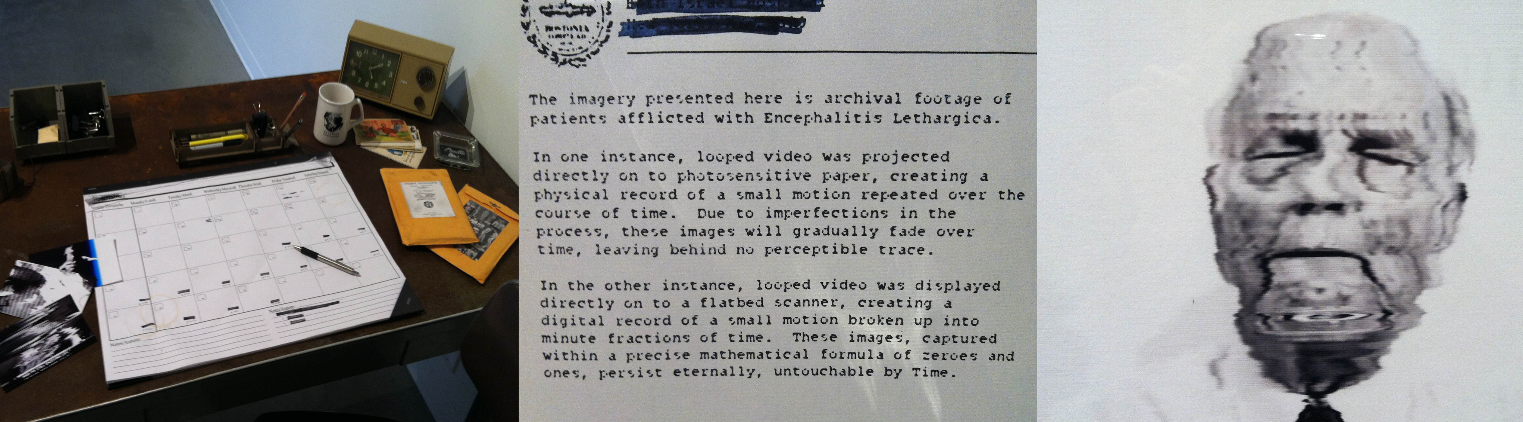 But let’s return to more positive territory. For instance, an artist who largely avoids the problems inherent to Devorak’s and Leigh’s pieces is Andrew Hoffman, whose mixed-media piece on encephalitis lethargica is both unique and emotionally evocative. A multi-layered work featuring text, photography, video and even a mock office set, Hoffman’s piece offers a number of different sensory experiences. The work also carries a palpable mood, an eerie quality reenforced by the unoccupied desk and the unnerving photography which hangs adjacent to it. If there is anything to critique about the man’s work it’s that it feels a little sparse at certain points. Quite frankly, I wanted to see more from the piece. Perhaps a few more objects to look at on the desk would have sufficed.